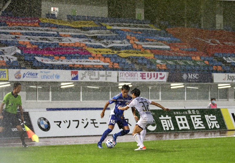 V-Varen Nagasaki and Giravanz Kitakyushu players refrained from shaking hands prior to the kickoff at the Transcosmos Stadium Nagasaki in Isahaya, Nagasaki Prefecture, and expressed appreciation to medical workers with a round of applause.