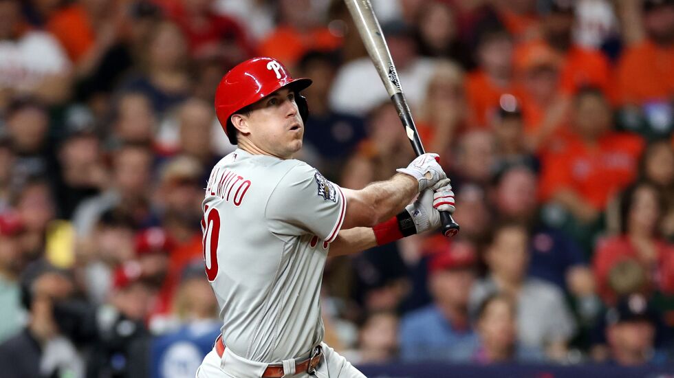 HOUSTON — J.T. Realmuto homered in the 10th inning and the Philadelphia Phillies, saved by right fielder Nick Castellanos’ sliding catch, rallied past the Houston Astros 6-5 Friday night in the World Series opener.