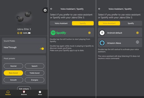 To get better sound, the Sound+ app includes several EQ presets and a few other settings to adjust. There’s not a lot to do here, but you can update the firmware and enable the “Find my Jabra” feature. You can also customize the left earbud’s controls. If you’re always talking to your phone’s assistant, you may want to enable that. You can choose between your phone’s default assistant (Google Assistant or Siri) or Amazon’s Alexa. Or, you can program the button to launch Spotify and begin playing music immediately, even if the app is closed. You can set either feature to a double-tap. Pressing the left earbud once turns on my favorite feature: HearThrough.