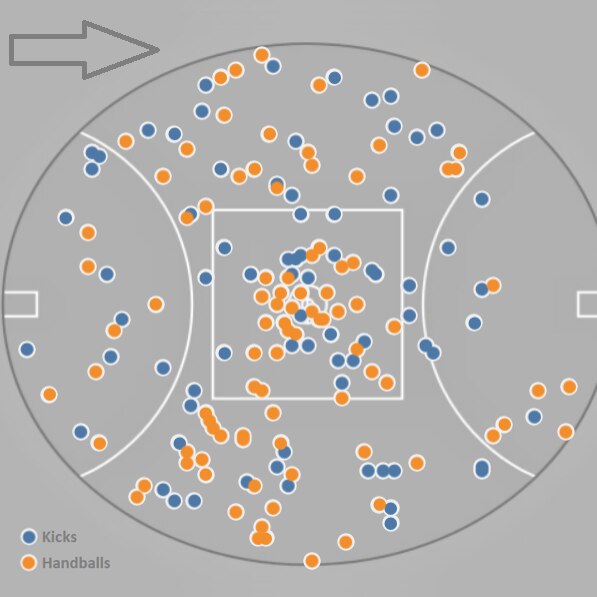 Jack Steele's kick and handball locations in 2022. (ABC Sport: Sean Lawson)