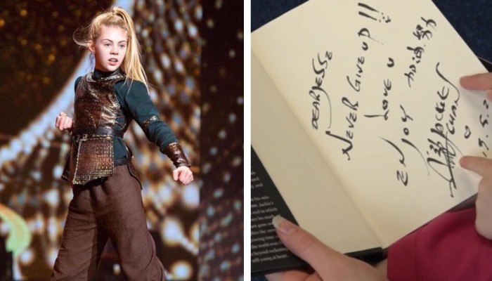 He gifted her a copy of one of his books, signed with the words: “Dear Jessie, Never Give Up, Love U, Jackie Chan.”