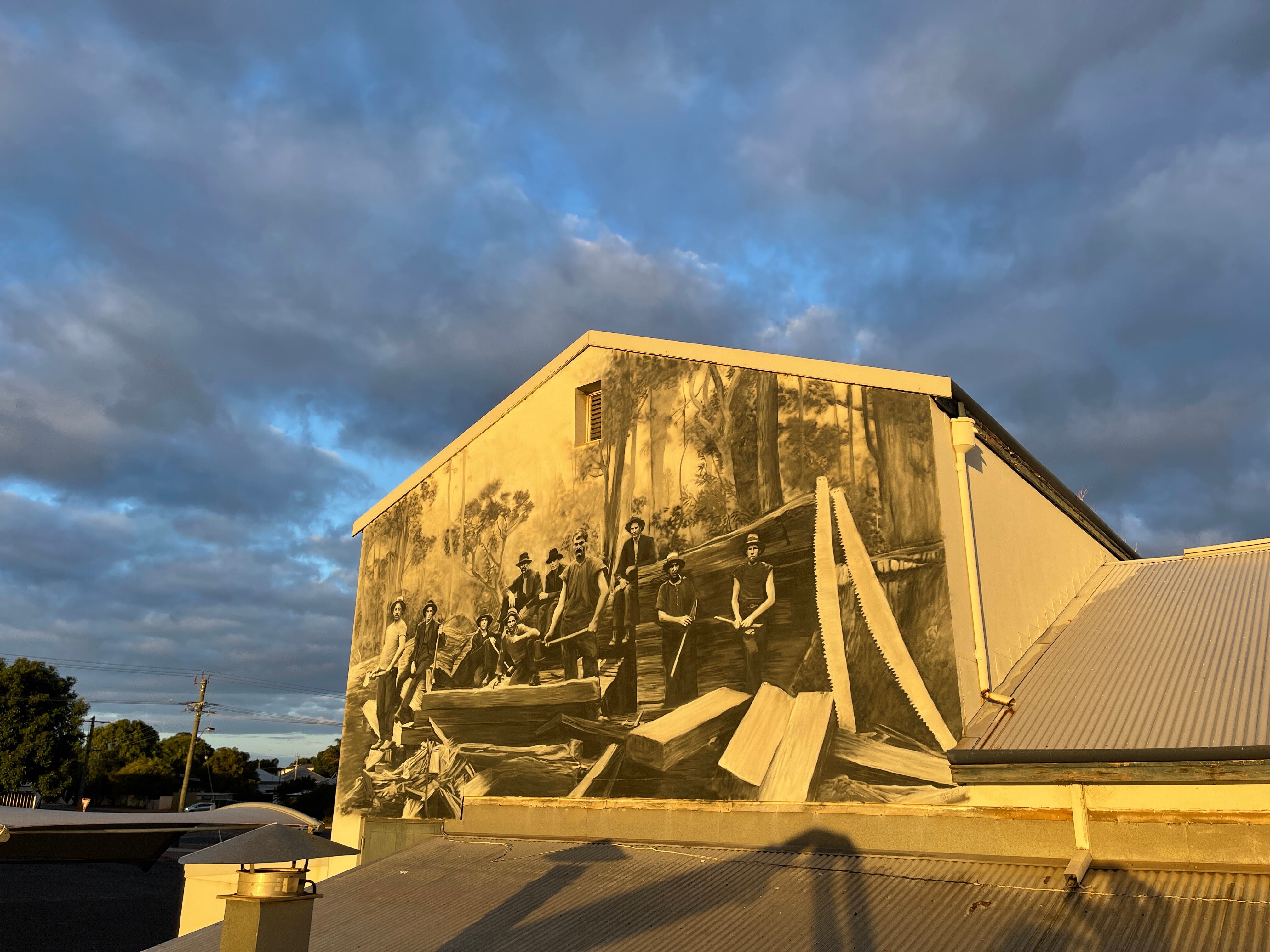 The mural is based on a photograph dating back to the early 1900s showing a team of timber workers.