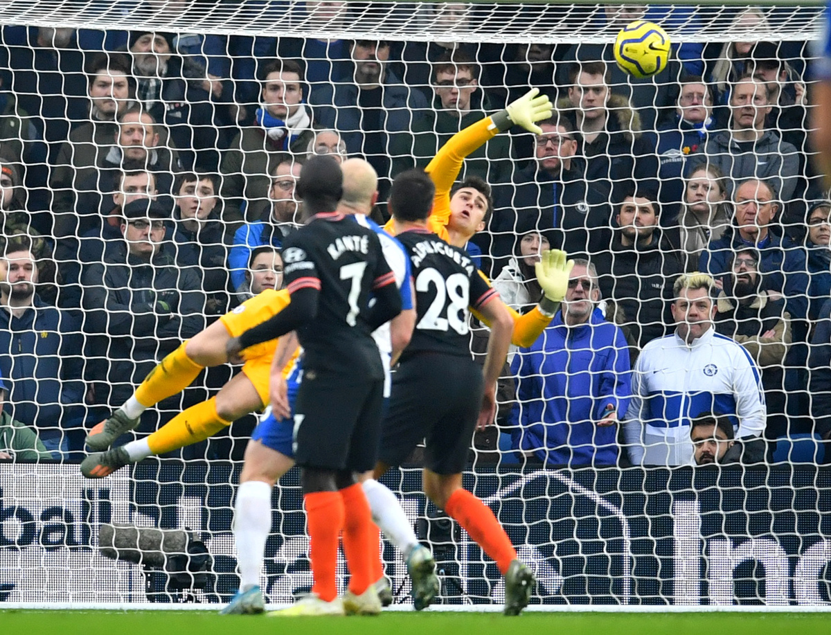 Soccer Football - Premier League - Brighton & Hove Albion v Chelsea - The American Express Community Stadium, Brighton, Britain - January 1, 2020 Chelsea's Kepa Arrizabalaga makes a save REUTERS/Dylan Martinez