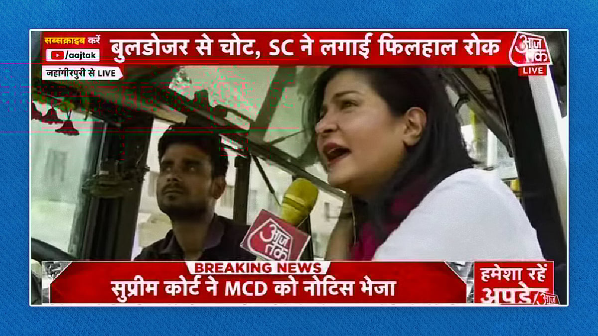 And Aaj Tak’s Anjana Om Kashyap climbed aboard a bulldozer herself – who doesn’t love a good photo op? – after asking its driver hard-hitting questions such as, “You never removed this juice corner completely, only the roof has been removed. Is there a reason why?”