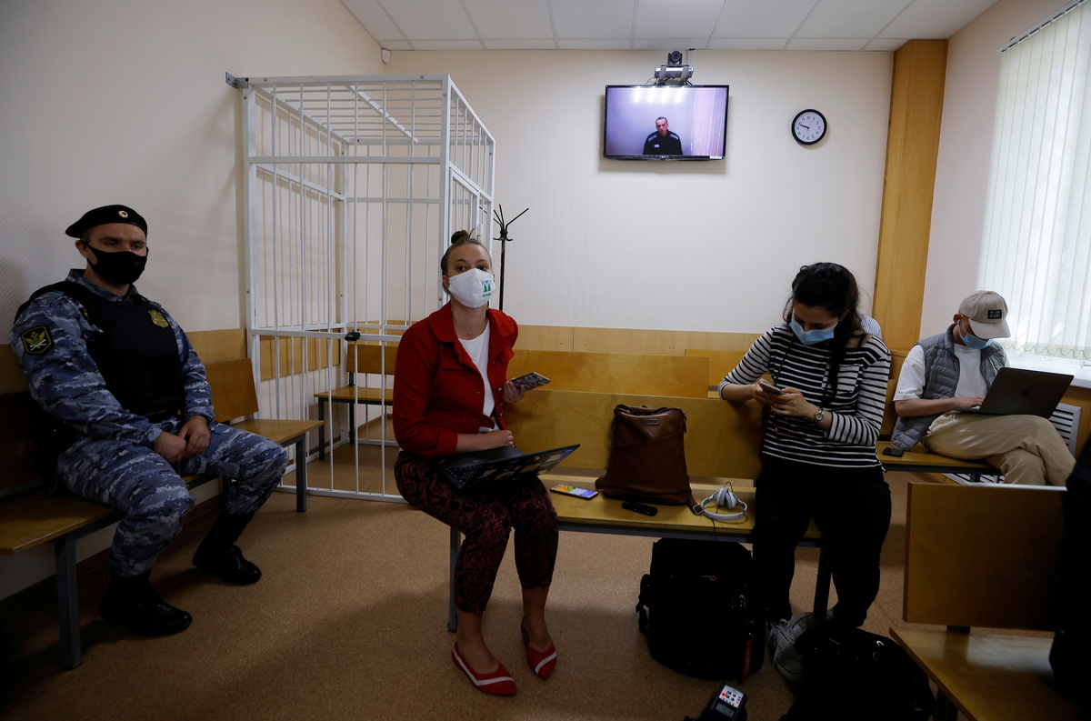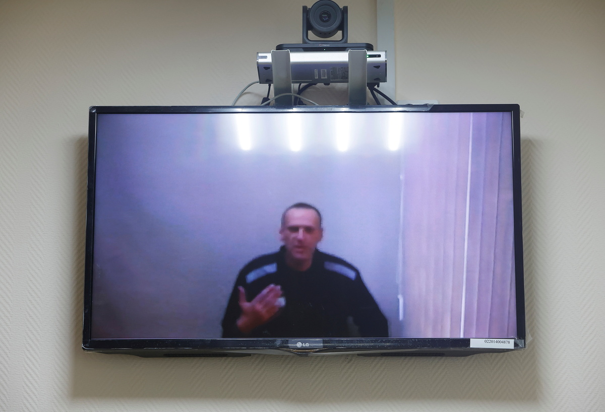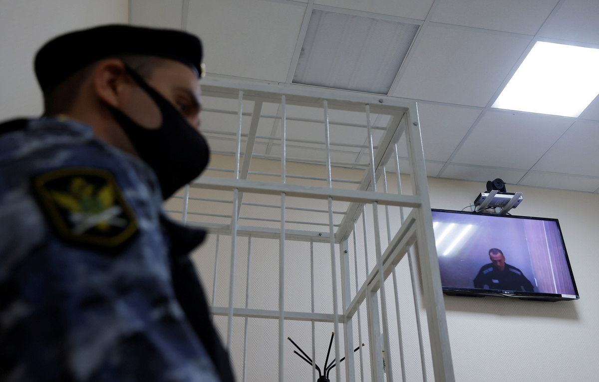 Russian opposition leader Alexei Navalny is seen on a screen via a video link during a hearing to consider his lawsuits against the penal colony over detention conditions there, at the Petushki district court in Petushki, Russia May 26, 2021. REUTERS/Maxim ShemetovRussian opposition leader Alexei Navalny gives a thumbs-up as he appears on a screen via a video link during a hearing to consider his lawsuits against the penal colony over detention conditions there, at the Petushki district court in Petushki, Russia May 26, 2021. REUTERS/Maxim Shemetov