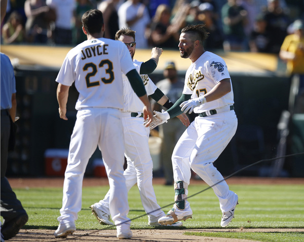 The A's let a golden opportunity slip away in the second inning. After Matt Chapman followed up a pair of lead off walks by Khris Davis and Jed Lowrie with a single to load the bases with no outs, Ryan Lavarnway struck out and Matt Joyce grounded into a double play to end the threat.