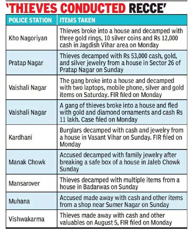 Probably the biggest heist was reported in Vaishali Nagar where unidentified thieves decamped with gold and diamond-studded rings, gold chains, bracelets, gold biscuits, and other valuable items along with cash worth Rs 11 lakh.