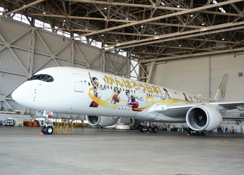 Images of some of the nation's top athletes, including tennis player Kei Nishikori and gymnastics superstar Kohei Uchimura, are painted on the side of the airplane with a message that reads "Go for it, Japan!"