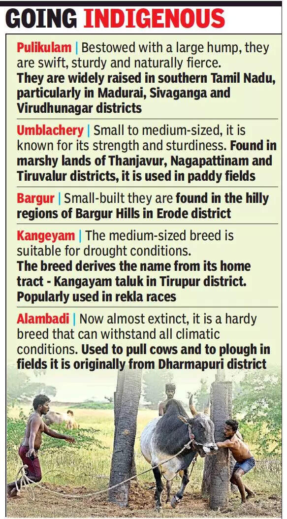 Tamil Nadu has five popular indigenous cattle breeds — Kangayam, Pulikulam, Umblachery, Alambadi and Bargur. While the hefty Kangayam bull in the western parts of the state is popular in rekla races, the swift Pulikulam bulls bestowed with a large hump, fierce nature and sturdy bodies are a natural for jallikattu. “The indigenous bulls with all their energy and stature would make the sport more interesting to watch,” says N Karthik Raja, a bull owner from Chinnapatti, who hopes the state will pass a government order to ensure only native breed bulls take part in jallikattu events.