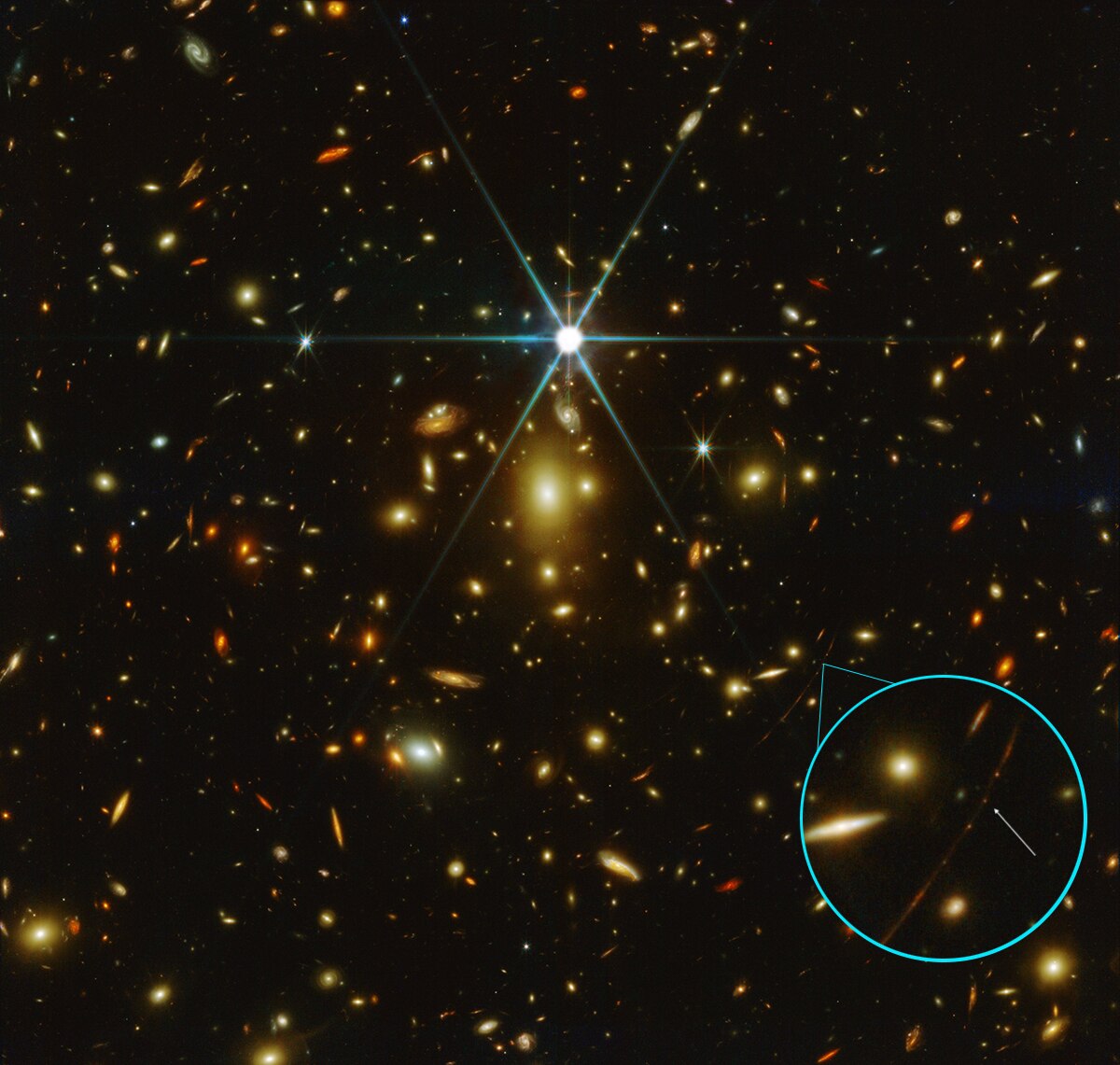 Earendel is estimated to be about 50 times the mass of the Sun and millions of times as bright, but is so distant it appears as a small dot in a line (see details in the inset) stretched by the gravity of the cluster in front of it.