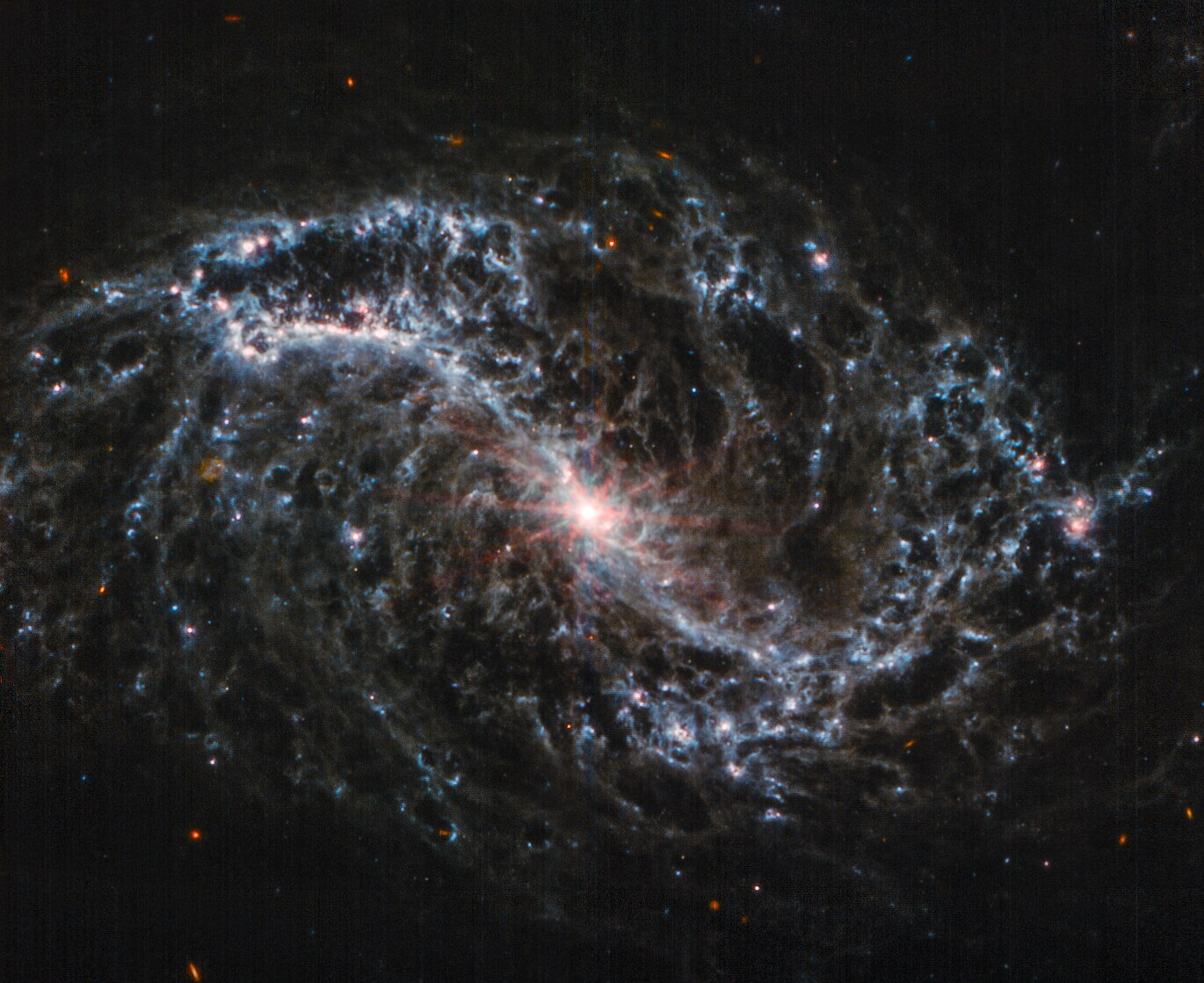 The JWST image reveals broiling spiral arms that are pockmarked with cavities.
