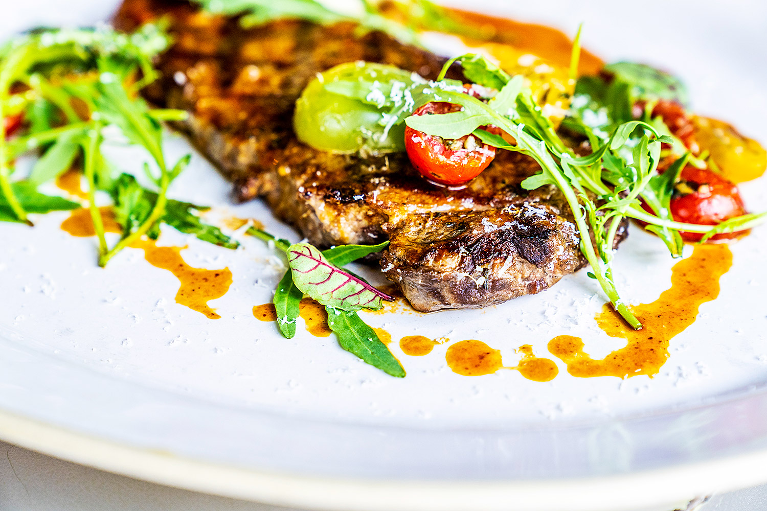 Mains choices include: pan-roasted salmon, mussels and squid in shellfish, tomato and white wine stew; pork chop with apple sauce; Calabrian chicken in spicy eggplant, tomato and black olive sauce, and wonderfully tasty and tender 10oz Angus sirloin served with chunky multi-hued heritage tomato salsa.