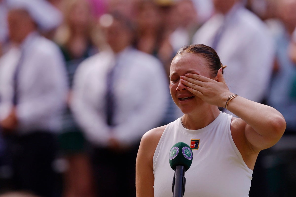 “I always want to thank the rest of the team who came for the finals,” she says, before addressing them in Polish. “I want to also thank everybody who makes this tournament so unique, I always was kind of anxious because of that because walking around here, being on Centre Court, for me it felt like a huge pressure and a bit too much but this year I really, really enjoyed it. I feel like I improved my game enough to feel comfortable here.” She thanks the organisers and staff, before her sponsors and “everybody supporting at home”, before thanking the crowd for coming, “for being a part of this amazing event. I’m always going to remember the opening of champagne bottles between serves! It’s a sound that will keep me up at night. It’s really amazing, I’m going to enjoy this moment, hopefully you’re going to enjoy tomorrow’s men’s final, and see you next year.”