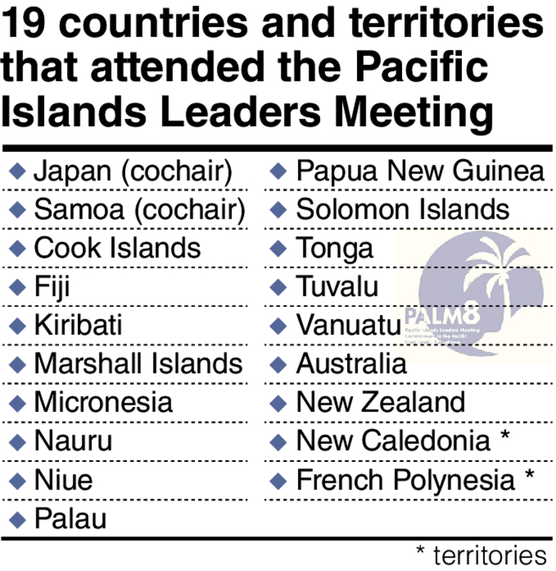 Leaders from Japan and Pacific island nations and territories discussed two major themes at the recent Pacific Islands Leaders Meeting -- how to deal with North Korea and how to promote mutual cooperation, particularly regarding Chinese maritime advancement.