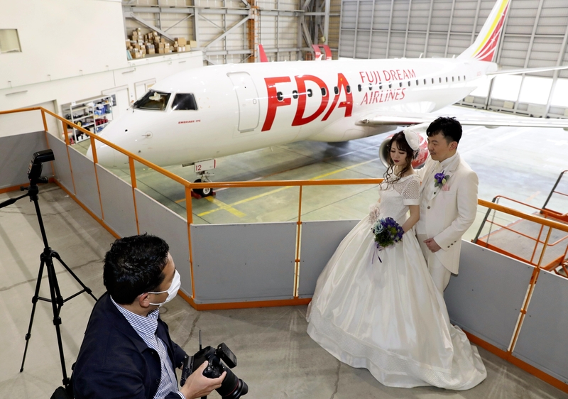 Fuji Dream Airlines has partnered with a bridal company to let couples take wedding photos in an aircraft hangar at Nagoya Airport in Aichi Prefecture, in lieu of a ceremony.