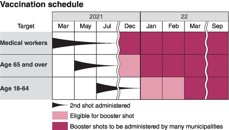 Generally, a third dose should be given after at least eight months from the second dose, but the ministry decided it can be administered after six months if municipal governments feel the need based on such factors as the coronavirus infection situation, as some data suggest that vaccine efficacy is reduced by half after about six months from the second dose.