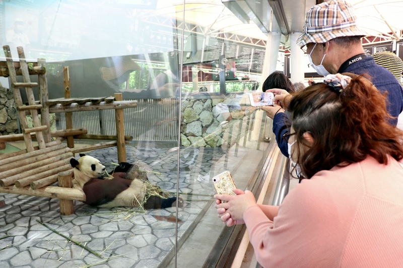 Within the park, many guests stood in front of the popular panda exhibit and took pictures. A man who came from Wakayama City with his wife said, "It was nice [to get outside] after having to stay indoors for so long, and I'm glad to see the pandas are doing well."