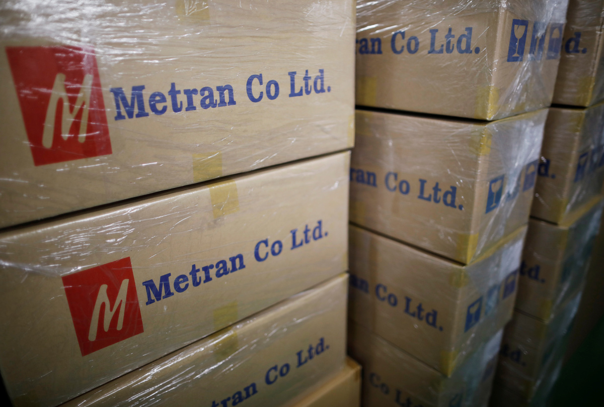 The logos of Metran Co. are seen on the boxes for delivering ventilators, at the factory in Kawaguchi, north of Tokyo, Japan April 2, 2020. REUTERS/Issei Kato
