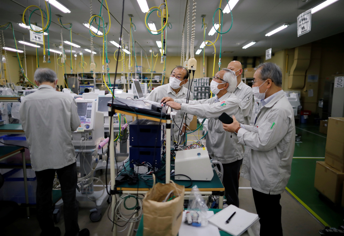 Employees of Metran Co. check the company's 'Compos X' ventilator, which was originally developed for animals but may be used for human coronavirus disease (COVID-19) patients, at their factory in Kawaguchi, north of Tokyo, Japan April 2, 2020. REUTERS/Issei Kato