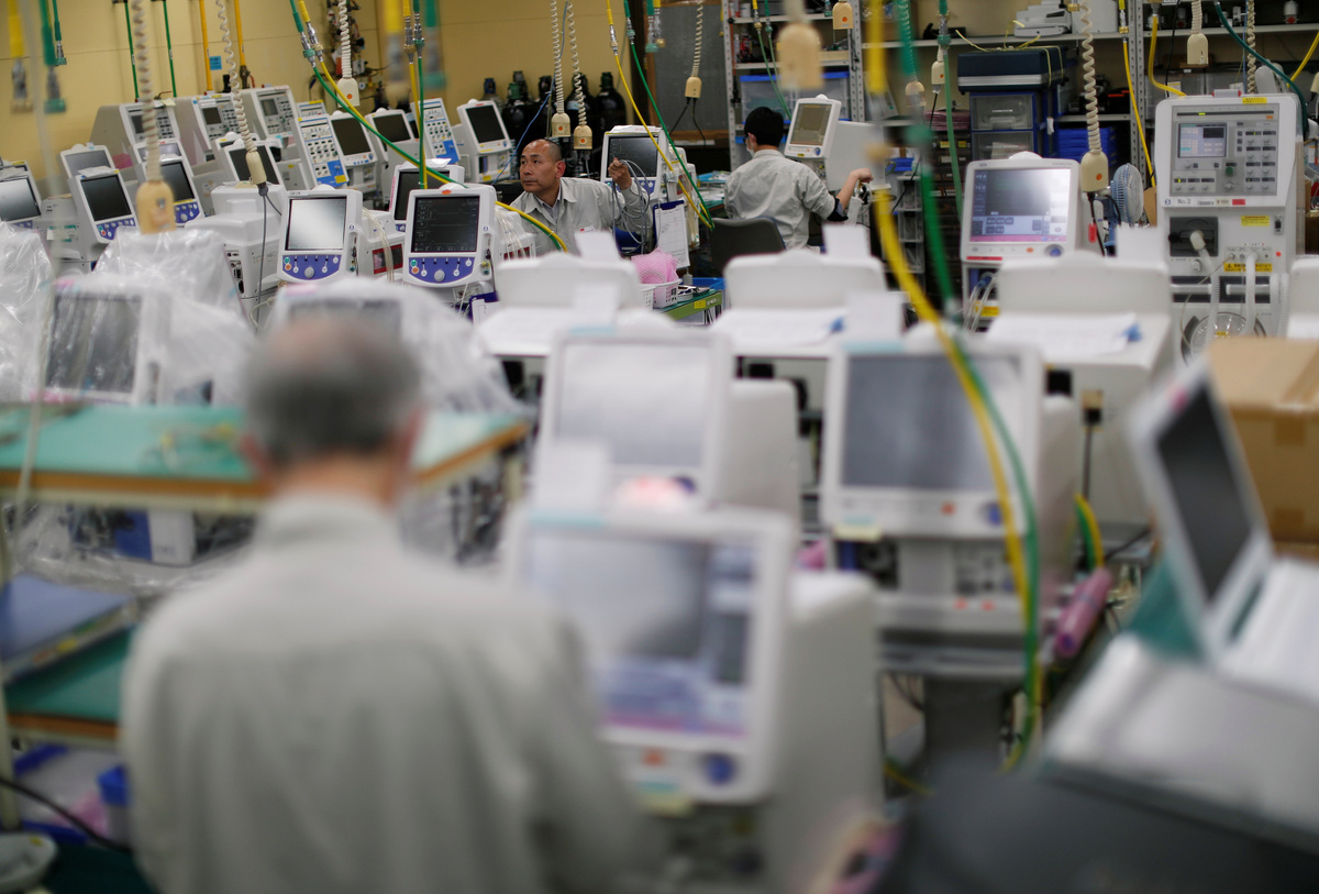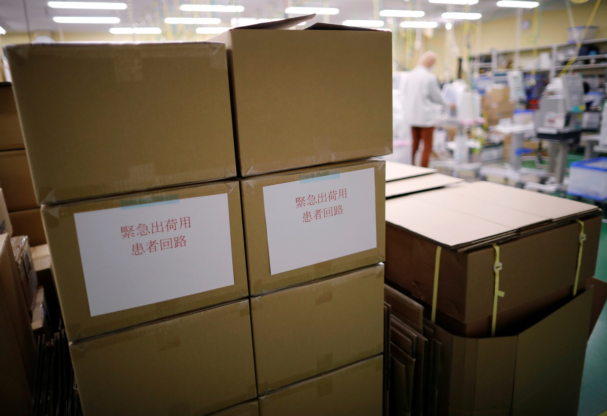 The labels reading 'For urgent shipment' are taped on the boxes for delivering ventilators, at the Metran Co. factory in Kawaguchi, north of Tokyo, Japan April 2, 2020. REUTERS/Issei KatoParts of Metran Co.'s 'Compos X' ventilator, which was originally developed for animals but may be used for human coronavirus disease (COVID-19) patients, are seen at the company's factory in Kawaguchi, north of Tokyo, Japan April 2, 2020. REUTERS/Issei KatoAn employee of Metran Co. tests the company's 'Compos X' ventilator, which was originally developed for animals but may be used for human coronavirus disease (COVID-19) patients, at their factory in Kawaguchi, north of Tokyo, Japan April 2, 2020. REUTERS/Issei KatoAn employee of Metran Co. tests the company's 'Compos X' ventilator, which was originally developed for animals but may be used for human coronavirus disease (COVID-19) patients, at their factory in Kawaguchi, north of Tokyo, Japan April 2, 2020. REUTERS/Issei KatoEmployees of Metran Co. check the company's ventilators, that were originally developed for animals but may be used for human coronavirus disease (COVID-19) patients, at their factory in Kawaguchi, north of Tokyo, Japan April 2, 2020. PREUTERS/Issei KatoAn employee of Metran Co. checks the company's 'Compos X' ventilator, which was originally developed for animals but may be used for human coronavirus disease (COVID-19) patients, at their factory in Kawaguchi, north of Tokyo, Japan April 2, 2020. REUTERS/Issei KatoA unit of Metran Co.'s 'Compos X' ventilator, which was originally developed for animals but may be used for human coronavirus disease (COVID-19) patients, is seen at the factory in Kawaguchi, north of Tokyo, Japan April 2, 2020. REUTERS/Issei Kato