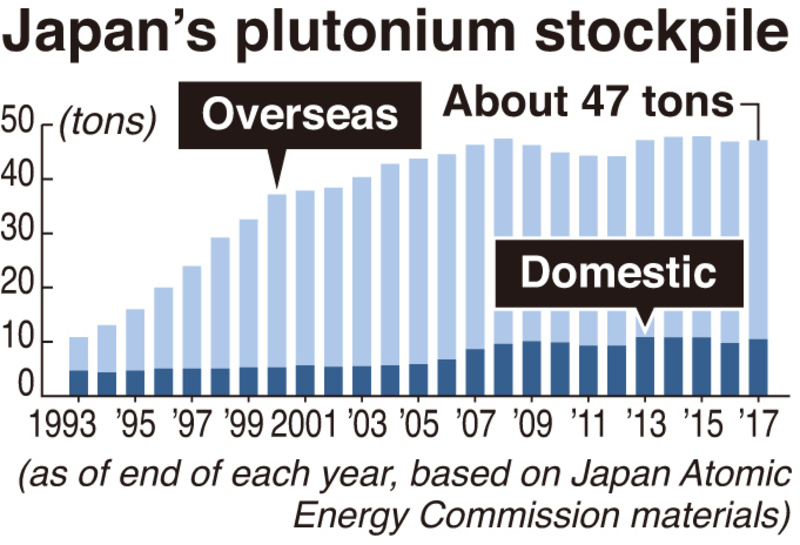 The commission also disclosed the amount of plutonium in Japan's possession as of the end of 2017. About 36.7 tons of Japanese plutonium was held in Britain and France, while about 10.5 tons was stored domestically for a total of about 47.3 tons. This is up 0.4 tons from the end of 2016 and is equivalent to about 6,000 times the amount of plutonium in the atomic bomb that was dropped on Nagasaki.