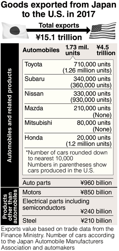 Trade statistics for 2017 released by the Finance Ministry show that automobile exports to the United States totaled 4.5 trillion yen. If 960 billion yen for auto parts is included, the export figure increases further. Japan's steel products, which have been subjected to U.S. import restrictions, make up 1.4 percent of the nation's total exports. Those restrictions have a limited impact on the Japanese economy as a whole.