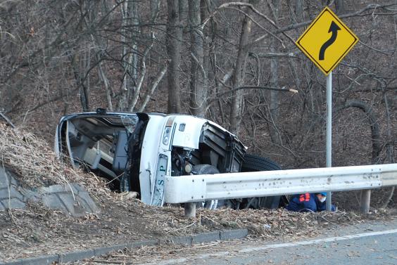 Japanese TV networks showed a white bus lying on its side in a ditch by the side of the road. The front of the vehicle, with its shattered windscreen, appeared to have suffered the worst damage.