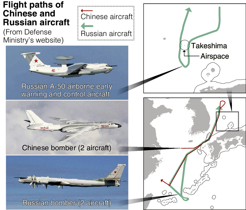 Meanwhile, Russia's Defense Ministry announced Tuesday that the Russian and Chinese air forces conducted their first joint patrol over the Sea of Japan. In addition to the A-50, the Chinese and Russian strategic bombers joined the patrol, flying over the Sea of Japan and the East China Sea. The ministry also said the planes flew more than 25 kilometers away from Takeshima, denying that Russia had violated the airspace that extends about 22 kilometers from the islets.