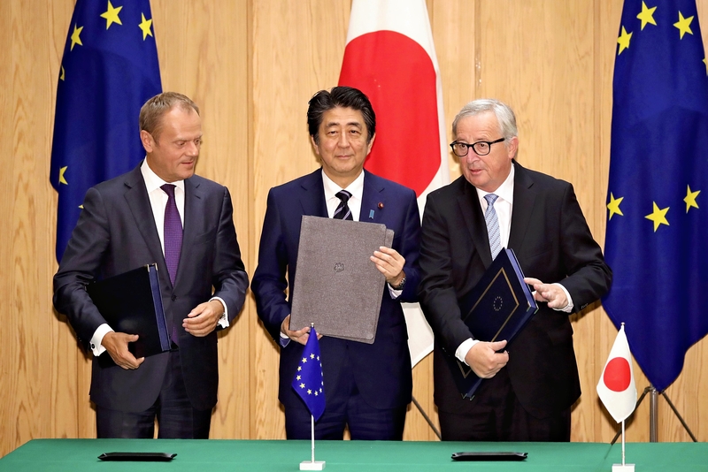 Prime Minister Shinzo Abe, European Council President Donald Tusk and European Commission President Jean-Claude Juncker signed the Japan-EU economic partnership agreement on Tuesday in Tokyo following their summit meeting in the Japanese capital.