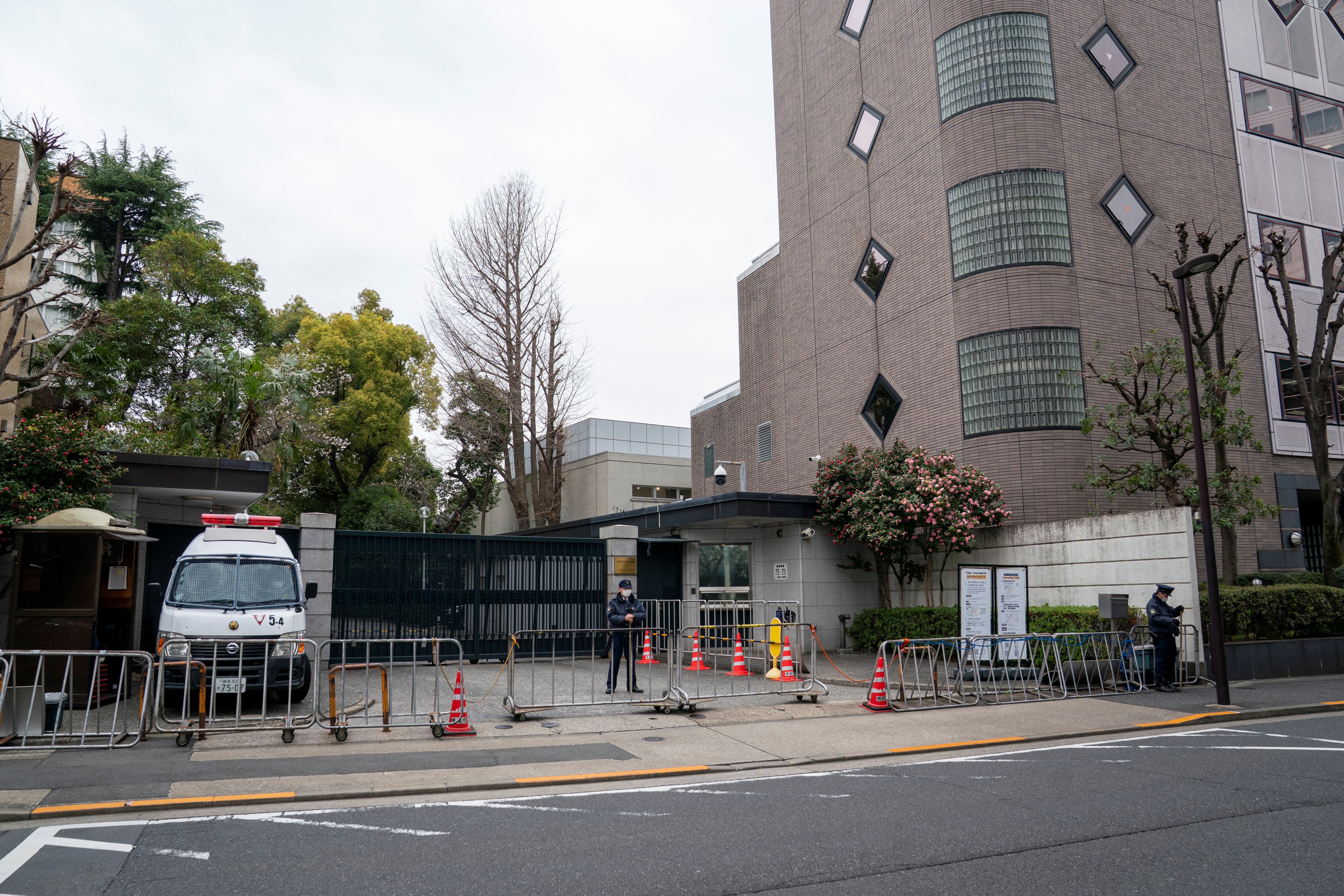 Kodai Murata, a 23-year-old officer with the Self-Defence Forces, was arrested by the Tokyo metropolitan police for allegedly scaling the walls of the heavily guarded embassy carrying an 18cm knife on Tuesday around 9am local time.