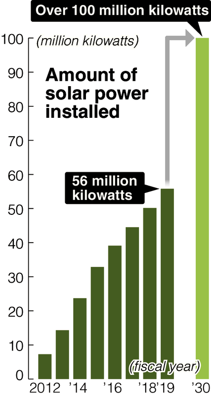 According to the Economy, Trade and Industry Ministry, solar power capacity in fiscal 2019 was about 56 million kilowatts, accounting for 6.7% of total power consumption. To reach the 2030 renewable energy target, analysts believe solar capacity will need to grow to more than 100 million kilowatts.
