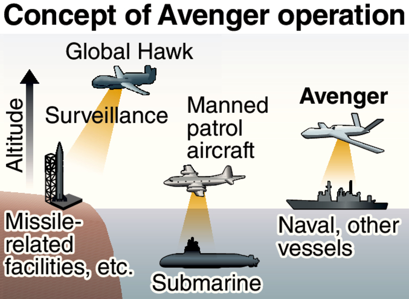 Equipped with a jet engine, the Avenger can fly at a maximum speed of 740 kph and operate 18 hours or longer per flight. It is said the aircraft can be equipped with antiship missiles and bombs, enabling it to counter enemy naval vessels and other units without endangering personnel should a contingency arise.
