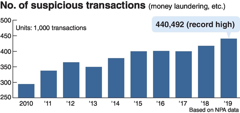 According to the National Police Agency, a record 440,492 transactions were reported in 2019 on suspicion of being connected to money laundering and other similar crimes, about 1.5 times more than in 2010.