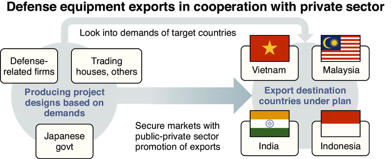 Japan's government will promote defense equipment exports to Vietnam, Malaysia, Indonesia and India. They were chosen in consideration of the fact that Japan has been holding active defense exchanges with these nations, and because they are strongly interested in strengthening their military and police systems.