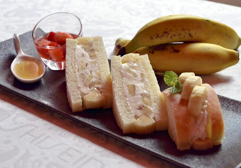 Restaurants are using Mongee Bananas in their dishes. Salon de Cafe, a restaurant in Shiseido Parlour Co.'s flagship building in Tokyo's Ginza district, sells a limited number of fruit sandwiches made with the bananas at 1,890 yen. The restaurant does not use the skin for the dish, and serves the fruit with a not-overly sweet cream to bring out the fruit's natural sweetness.