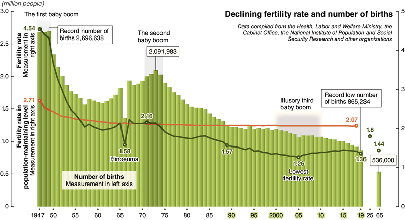 The drop in the number of births is not stopping. Last year saw a record low of 865,000 births, and the fertility rate stood at 1.36, far below the 2.07 figure needed to maintain the population, according to statistics released this month.