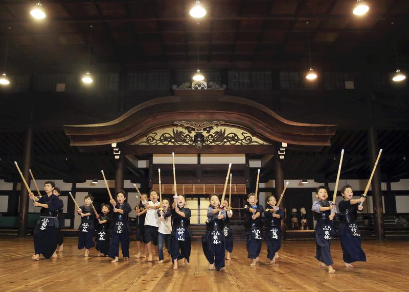 They were taking part in the kendo lessons that the Kyoto Kendo Federation has continued for more than 50 years in the famed martial arts building. That day, about 30 elementary and junior high school students were swinging shinai bamboo swords with serious expressions on their faces.