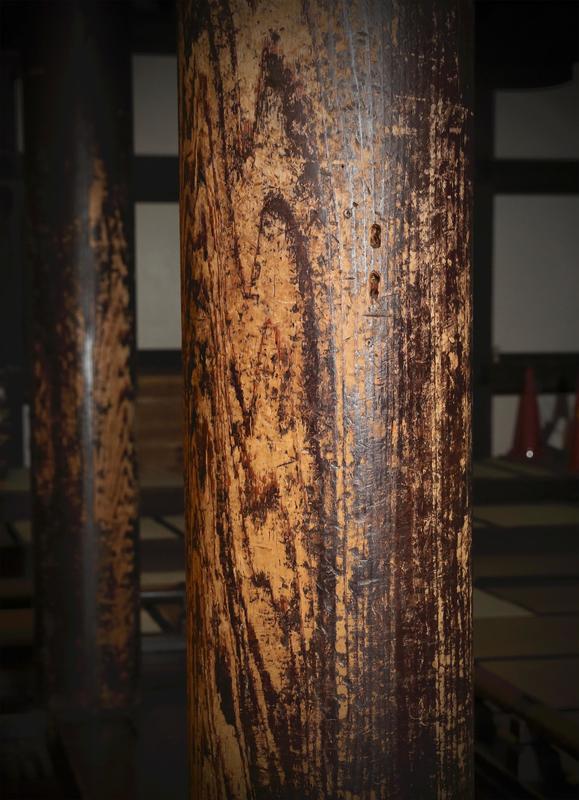 A large number of young people trained at the school. The surface of a pillar in the training hall has chipped-off spots and many scratches, showing how hard training was in the past and how long the training hall has been in use.