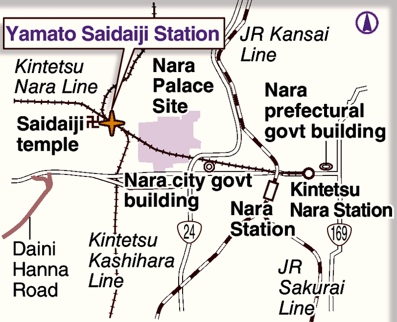 It takes about 40 minutes by express from Osaka-Namba Station and about 45 minutes by express from Kyoto Station to reach Kintetsu Yamato Saidaiji Station.