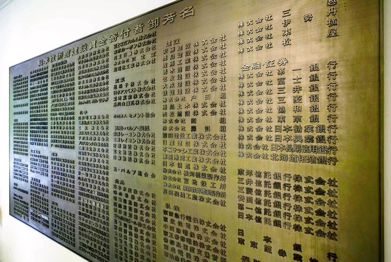 The museum was established with strong support from such fields as politics and business, as the driving force behind economic development was believed to be support of scientific technology. The panel bears the names of more than 200 companies and organizations. Many of the companies listed no longer exist, making us feel the passage of history.