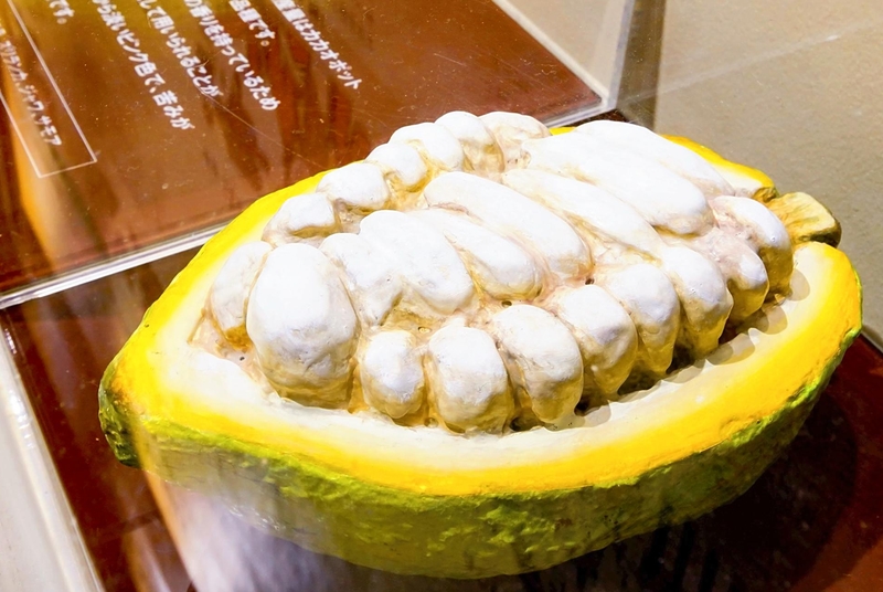 The main ingredient in chocolate is cacao beans, which are grown in West Africa, Central and South America, and Southeast Asia. Each cacao fruit contains 30 to 40 seeds. The museum has a full-size model of a cacao fruit that is 30 centimeters long.
