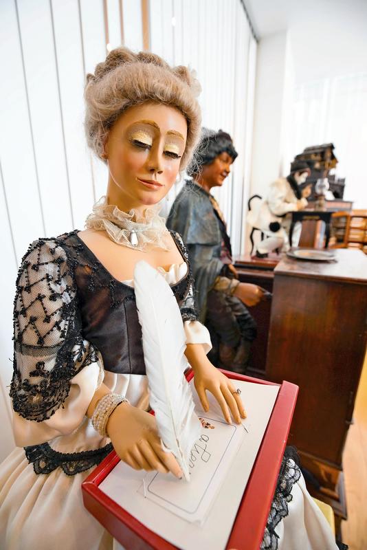 Children who visit the museum are fond of the automatons. Made in France, a clown and an aristocratic lady who both write letters in time to the music flank a sad, third person in the love triangle from whom the clown and lady are concealing their thoughts. The aristocratic lady is a fine piece that actually writes on the paper.
