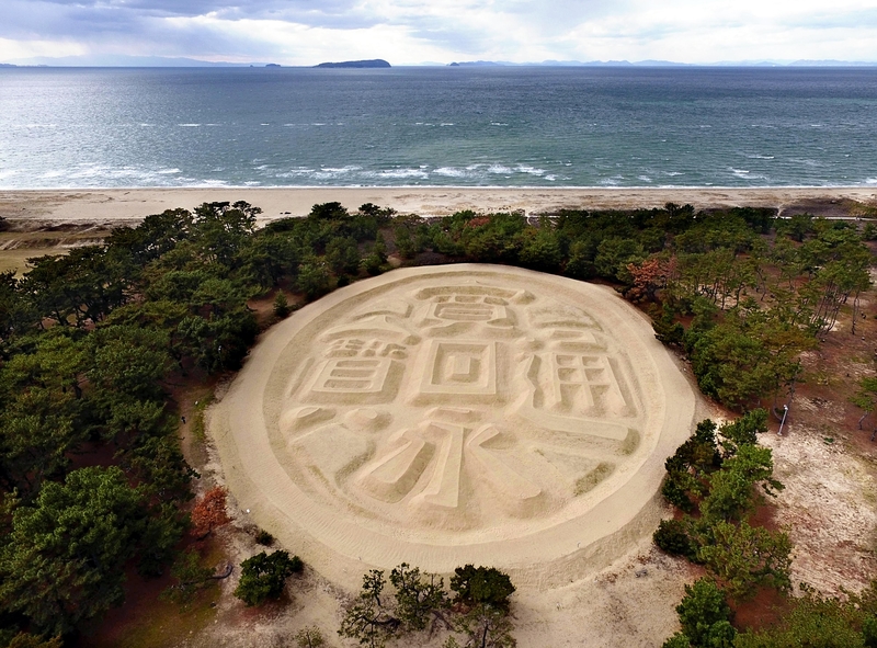 The Zenigata Sunae (coin-shaped sand sculpture) is an oval measuring 122 meters east to west and 90 meters north to south. When seen from an observation platform near the 58.3-meter peak of Mt. Kotohiki to the east, it looks like a perfect circle. The sculpture is not only enormous, it is exquisitely designed.
