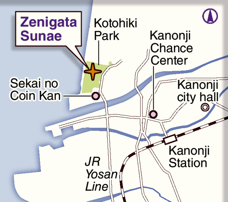 The Zenigata Sunae and observation deck are in Kotohiki Park, which is a five-minute taxi ride from JR Kanonji Station. The park is also home to the Sekai no Coin Kan, a museum with about 2,000 pieces of currency from all over the world. Kanonji Station is about two hours from Shin-Osaka Station. Change from the bullet train to the Shiokaze limited express at Okayama Station.