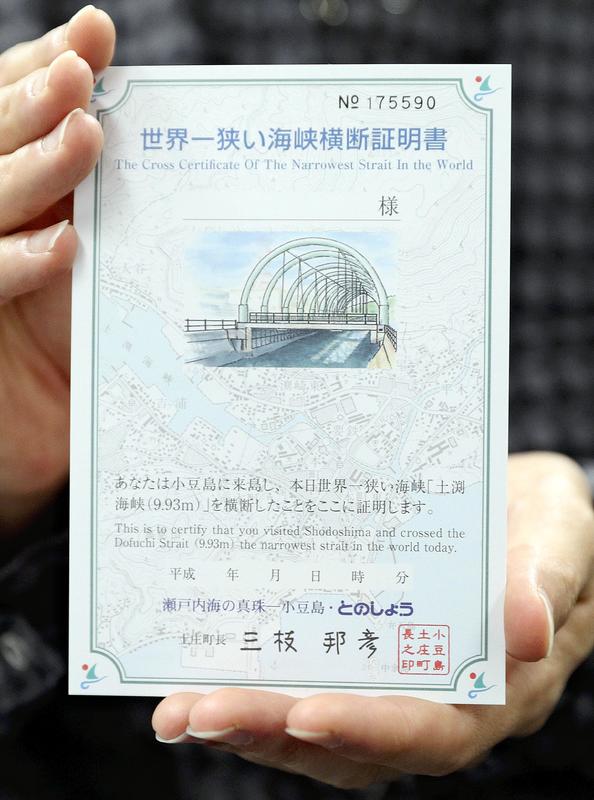 For 100, yen the town provides certificates to people who have "traversed" the strait. Since February 1996, more than 175,000 certificates have been issued.