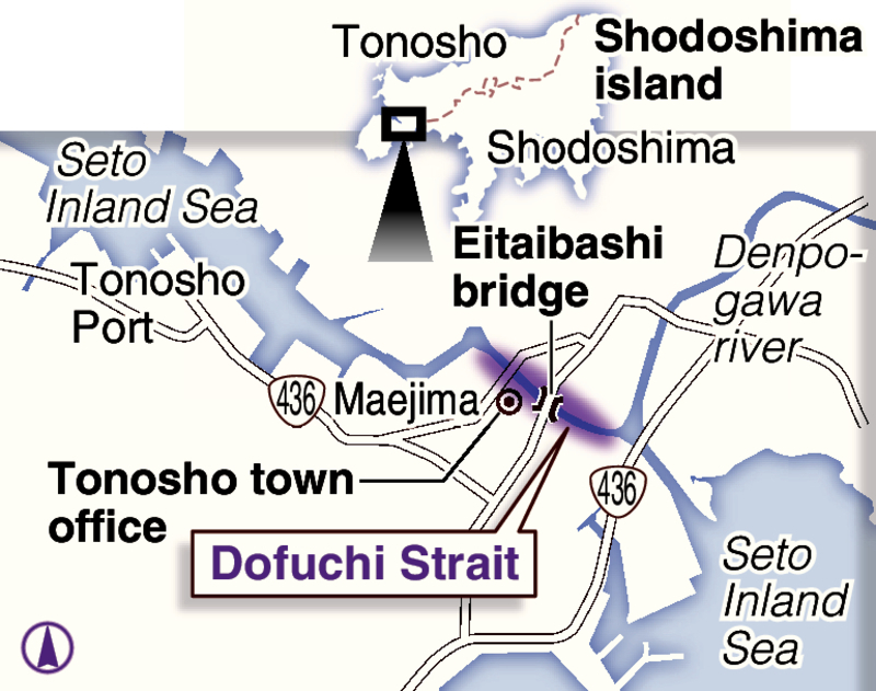 The town decided to deem it Dofuchi Strait, taking the first characters from Tonosho and from the Fuchizaki district on the Shodoshima side.