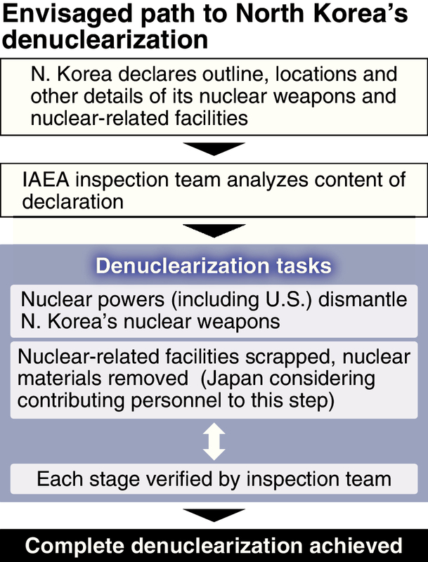 Under the denuclearization process envisaged by Japan, the United States and other nations, North Korea will first declare the entirety of its nuclear weapons and nuclear-related facilities, with the International Atomic Energy Agency verifying the content of this declaration through inspections and other steps. In addition, the United States would spearhead a stage-by-stage dismantling of North Korea's nuclear weapons and the scrapping and removal of its nuclear facilities. The IAEA would continue verification work during this process.