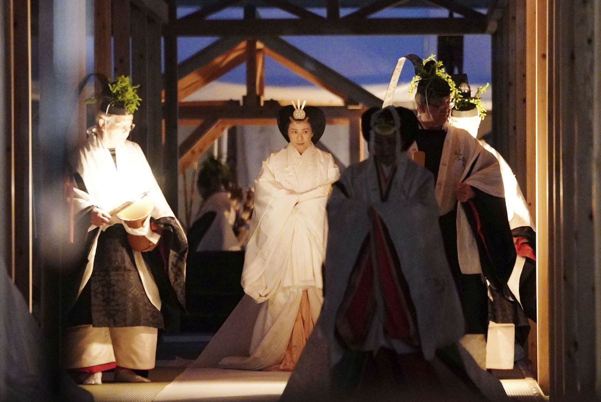 Amid flickering torchlight and chanting by priests, Emperor Naruhito emerged from behind the white curtains of the shrine at around 3:00 a.m., concluding a ceremony observed by Prime Minister Shinzo Abe and 400 dignitaries in an outdoor pavilion.