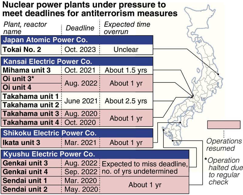 The No. 1 unit at Kyushu Electric Power Co.'s Sendai nuclear power plant was the first reactor in Japan to resume operations after the new regulations came into force. The deadline to build the required facility at this plant is March 2020, but Kyushu Electric expects this project will be completed about one year later. Kansai Electric Power Co.'s Takahama nuclear power plant is required to build such a facility for its No. 3 reactor by August 2020, but there are concerns this work might take about another year. The NRA's decision could have an impact on every reactor across the nation, including those yet to resume operations.