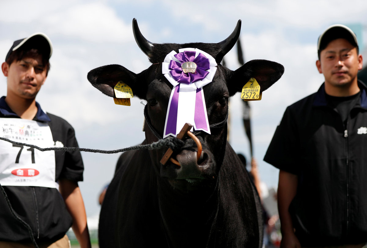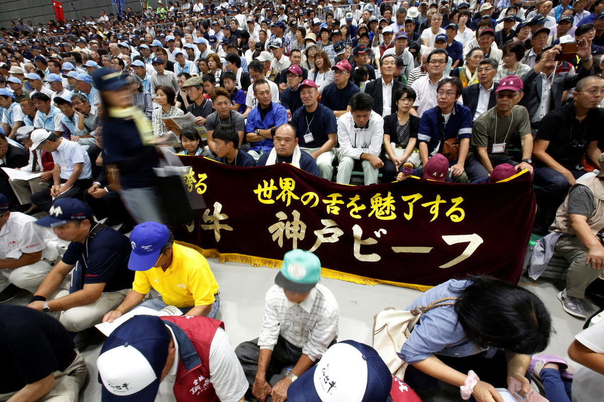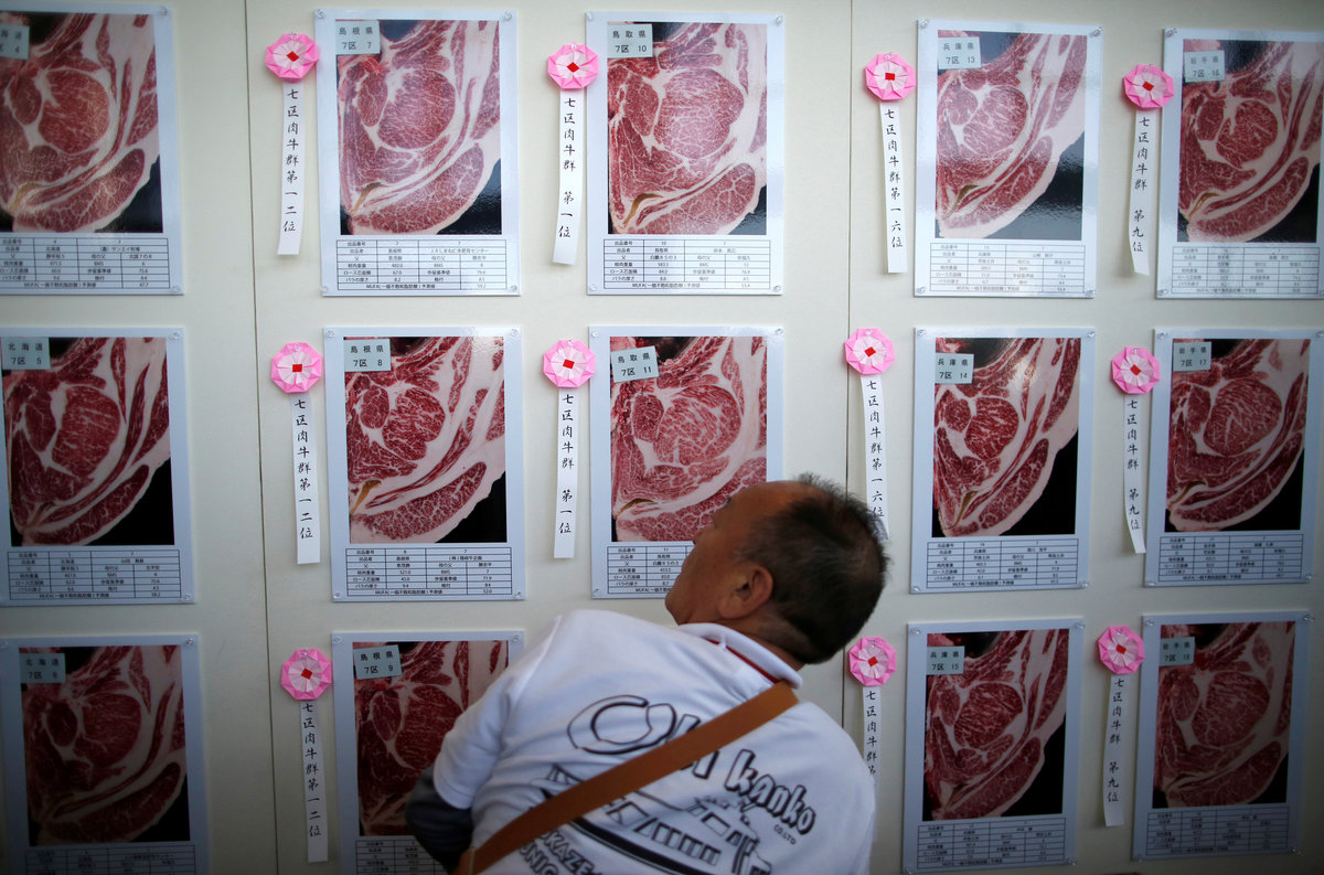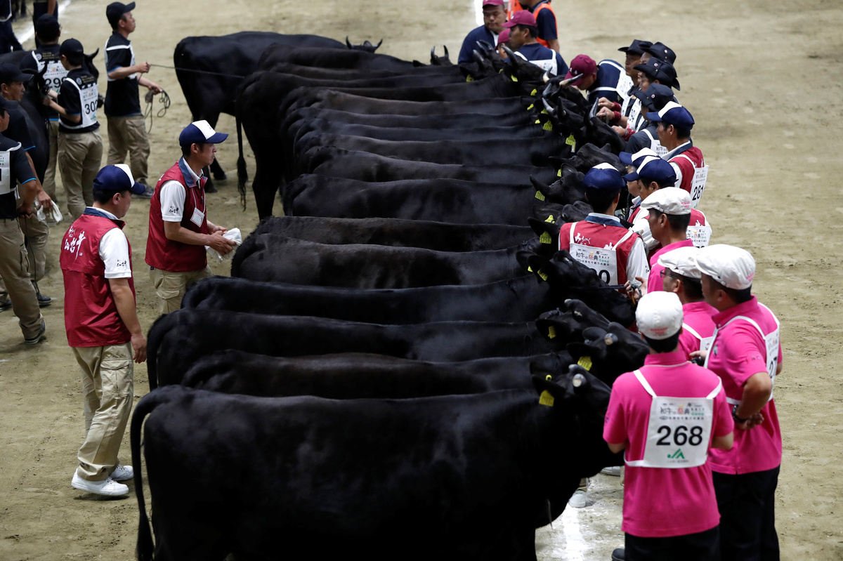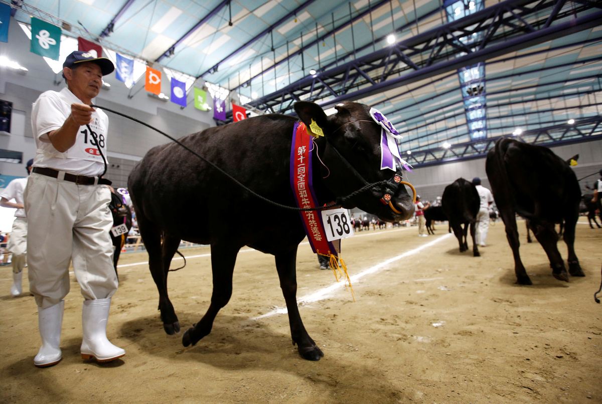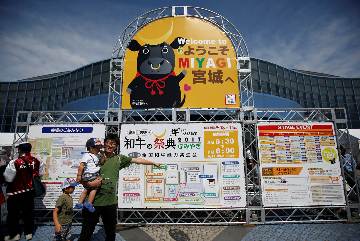 Visitors show off a banner cheering Kobe Beef during a division of breeding cattle category competition at 11th National Japanese Beef Ability Expo, commonly known as Wagyu Olympics, in Sendai, northern Japan September 10, 2017. Picture taken September 10, 2017. REUTERS/Issei KatoA man checks the pictures of award-winning carcass of beef cattle competitions at 11th National Japanese Beef Ability Expo, commonly known as Wagyu Olympics, in Sendai, northern Japan September 10, 2017. Picture taken September 10, 2017. REUTERS/Issei KatoCattle and breeders take part in a competition at breeding cattle category - young bull division competition at 11th National Japanese Beef Ability Expo, commonly known as Wagyu Olympics, in Sendai, northern Japan September 10, 2017. Picture taken September 10, 2017. REUTERS/Issei KatoVisitors are seen at the main entrance of the 11th National Japanese Beef Ability Expo, commonly known as Wagyu Olympics, in Sendai, northern Japan September 10, 2017. Picture taken September 10, 2017. REUTERS/Issei KatoBreeding cattle take part in a competition at 11th National Japanese Beef Ability Expo, commonly known as Wagyu Olympics, in Sendai, northern Japan September 10, 2017. Picture taken September 10, 2017. REUTERS/Issei KatoA visitor poses for a photographer with official cattle mascot Ushi-Masamune at 11th National Japanese Beef Ability Expo, commonly known as Wagyu Olympics, in Sendai, northern Japan September 11, 2017. REUTERS/Issei KatoVisitors are seen at the main entrance of the 11th National Japanese Beef Ability Expo, commonly known as Wagyu Olympics, in Sendai, northern Japan September 10, 2017. Picture taken September 10, 2017. REUTERS/Issei KatoA cattle, breeders and officials pose for a photograph during a photo session after winning a breeding cattle category competition at 11th National Japanese Beef Ability Expo, commonly known as Wagyu Olympics, in Sendai, northern Japan September 10, 2017. Picture taken September 10, 2017. REUTERS/Issei KatoBreeding cattle take part in a competition at 11th National Japanese Beef Ability Expo, commonly known as Wagyu Olympics, in Sendai, northern Japan September 10, 2017. Picture taken September 10, 2017. REUTERS/Issei KatoA group of female Bungo cattle from Oita prefecture, Fumigiku, Fumiayame, Fumiteru 10 and Fumiroman, are posed for a photograph with their owners including Tadanao Sato during a photo session after captured grand prize of the breeding cattle category at 11th National Japanese Beef Ability Expo, commonly known as Wagyu Olympics, in Sendai, northern Japan September 11, 2017. REUTERS/Issei KatoCattle and breeders from Iwate prefecture pose for a photograph at 11th National Japanese Beef Ability Expo, commonly known as Wagyu Olympics, in Sendai, northern Japan September 10, 2017. Picture taken September 10, 2017. REUTERS/Issei KatoAward-winning cattle parade at 11th National Japanese Beef Ability Expo, commonly known as Wagyu Olympics, in Sendai, northern Japan September 11, 2017. REUTERS/Issei KatoA female Bungo cattle Fumiayame from Oita prefecture and her owner Tadanao Sato are surrounded by media after captured grand prize of the breeding cattle category at 11th National Japanese Beef Ability Expo, commonly known as Wagyu Olympics, in Sendai, northern Japan September 11, 2017. REUTERS/Issei Kato
